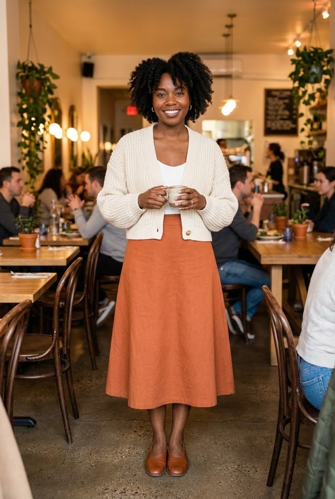 A cropped cardigan adds warmth without bulk. Paired with a high-waist skirt, the outfit feels cozy and flattering at the same time.