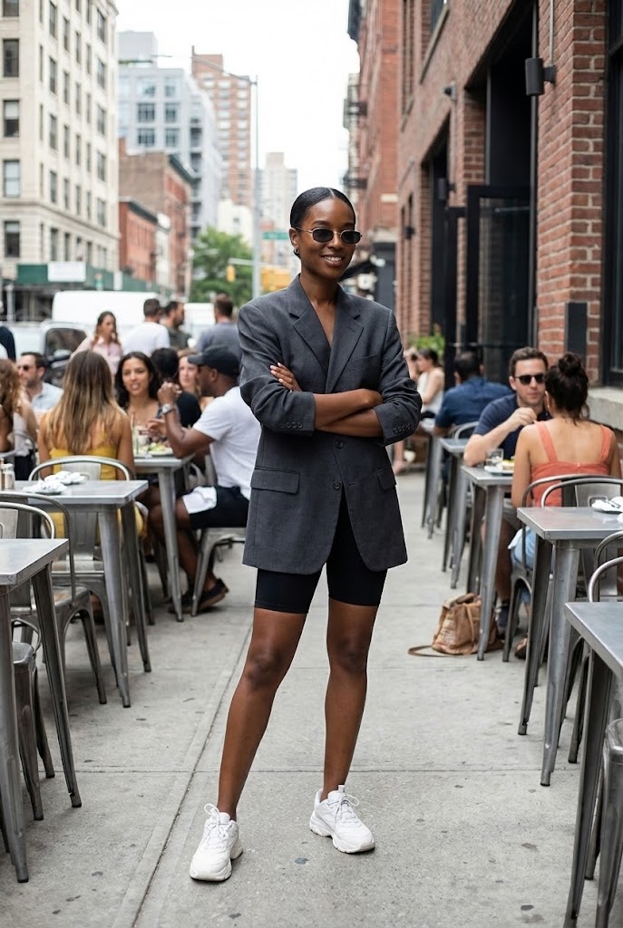 This outfit feels relaxed but confident. Bike shorts stretch easily and allow movement, while an oversized blazer adds structure.