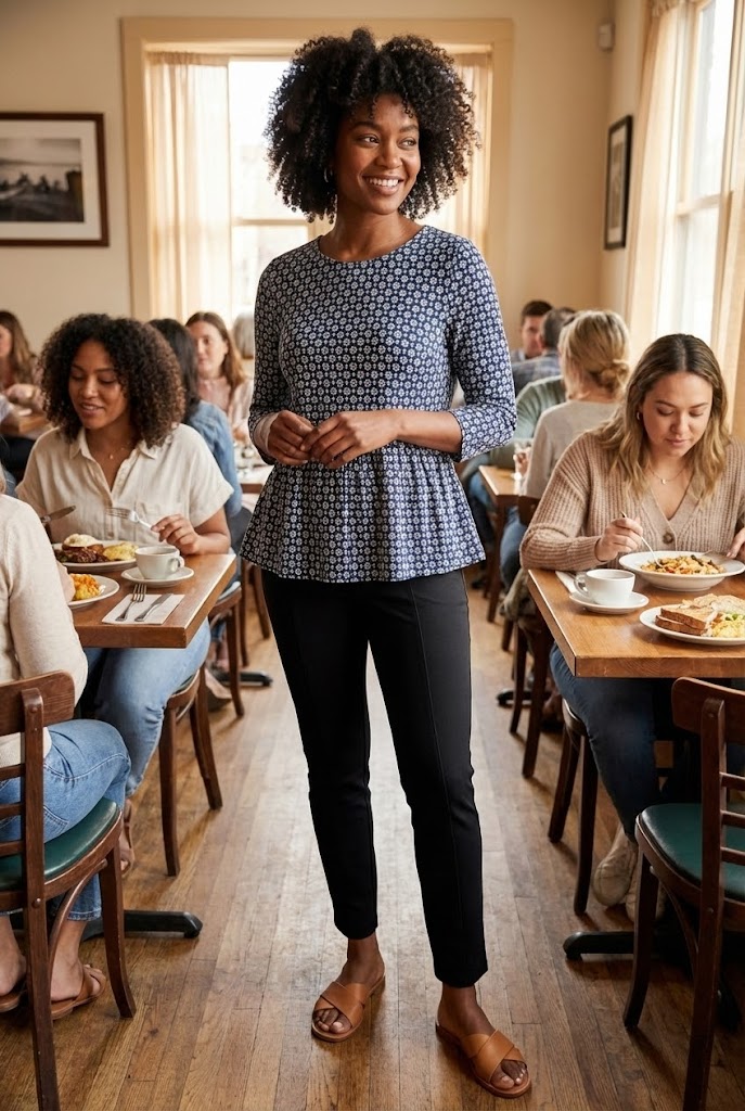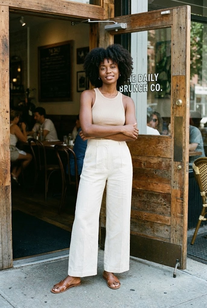 This outfit works well for indoor and outdoor brunch plans. Sneakers or sandals both fit the vibe, depending on how relaxed you feel.