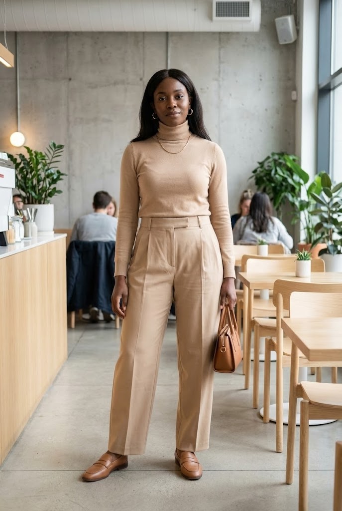 Neutral shades feel soft and polished. Playing with textures through shoes or bags adds interest without overdoing it.