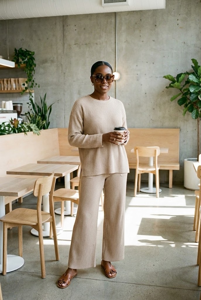 Matching lounge sets feel like a cheat code for brunch. You don’t overthink anything because the outfit already works. Knit or ribbed sets feel soft but still look intentional.