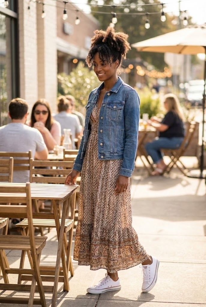 A casual maxi dress feels effortless and relaxed. It covers comfortably and allows easy movement. I added a denim jacket for structure and a little warmth.