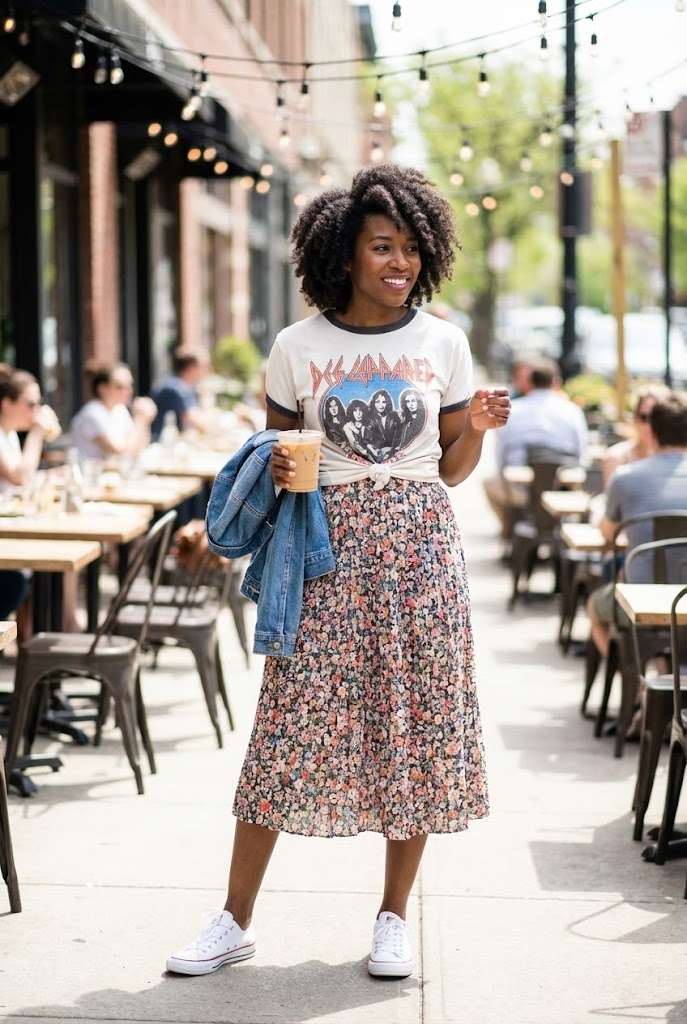 A skirt with a graphic tee feels fun and casual. The contrast adds personality while still keeping things relaxed. I usually knot the tee slightly to add shape.