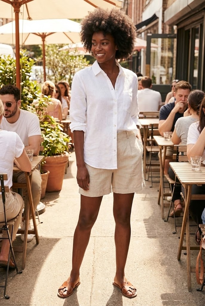 Linen shorts feel light and airy, especially for warm brunch mornings. Pairing them with a loose button-down keeps the outfit clean and relaxed.