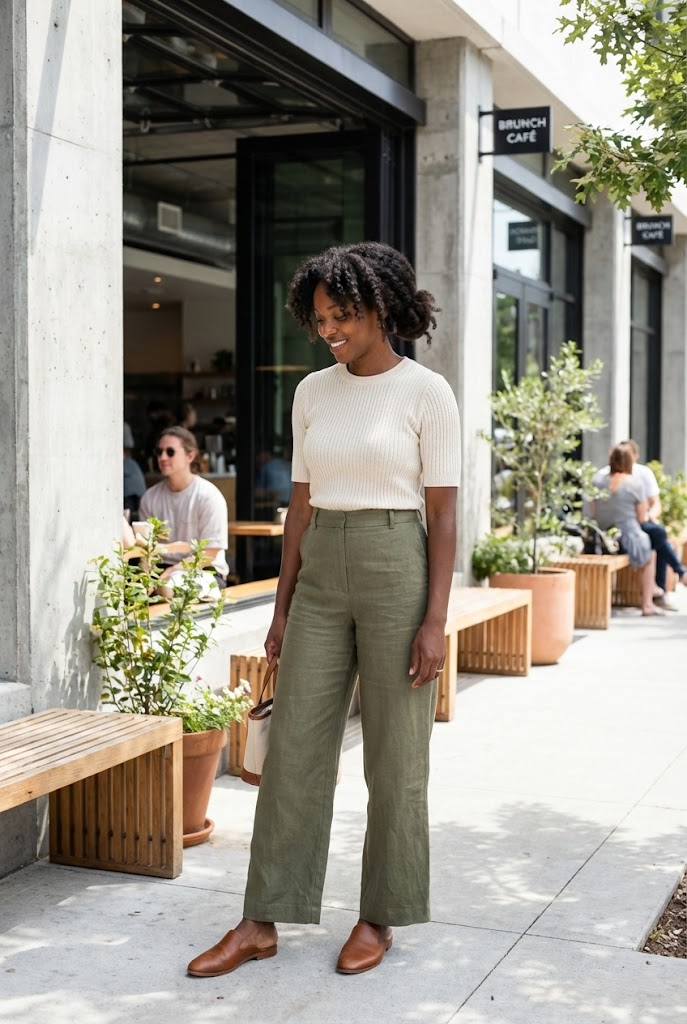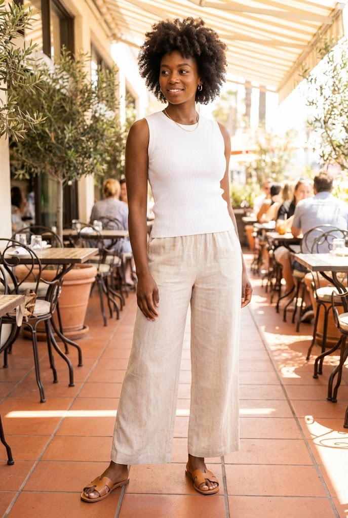 Linen pants breathe, which makes them perfect for warm brunch spots. A sleeveless top keeps the look light.
