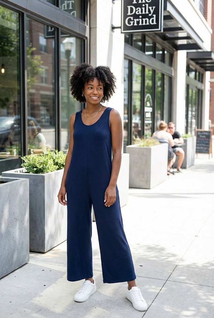 A jumpsuit solves outfit math fast. Sneakers keep it grounded and practical.