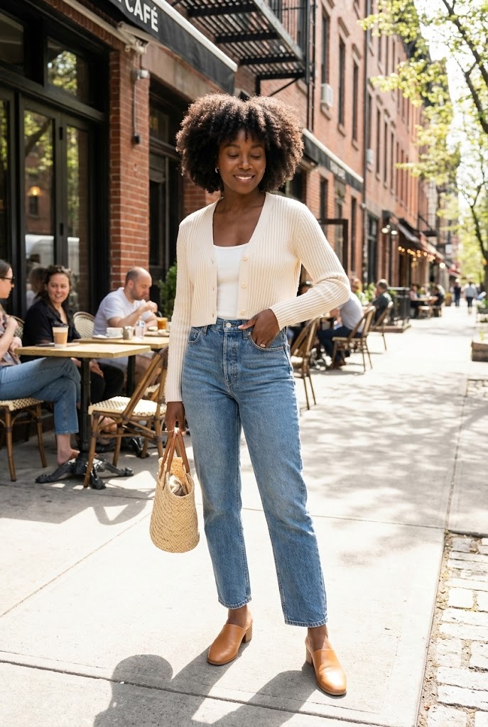 13. Cropped Cardigan with High-Waist Jeans