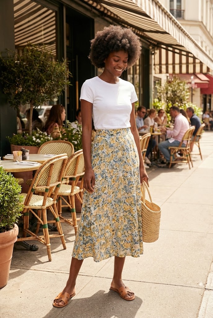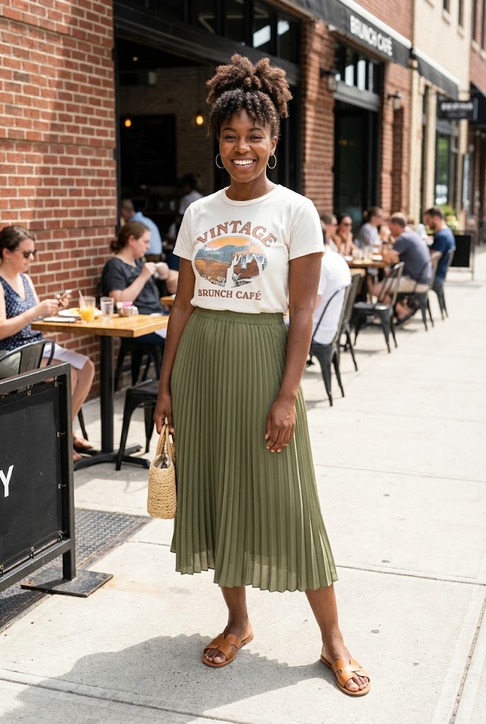 A graphic tee keeps things fun, and a midi skirt keeps it neat. This mix feels relaxed but thoughtful.