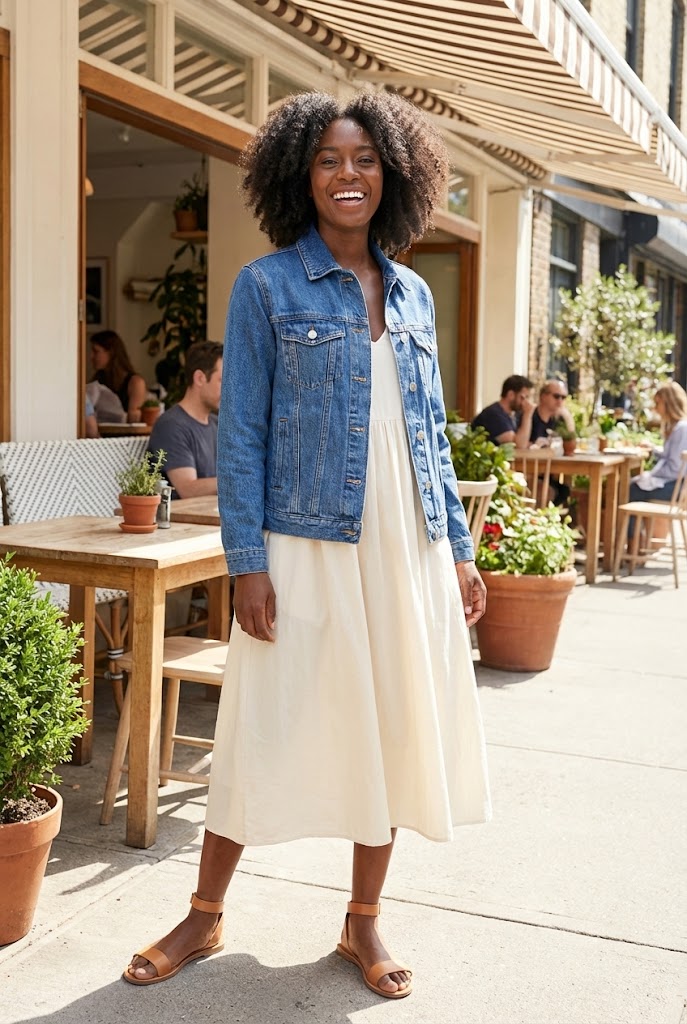 This outfit handles unpredictable weather like a champ. A soft dress keeps things light, and a denim jacket adds balance.