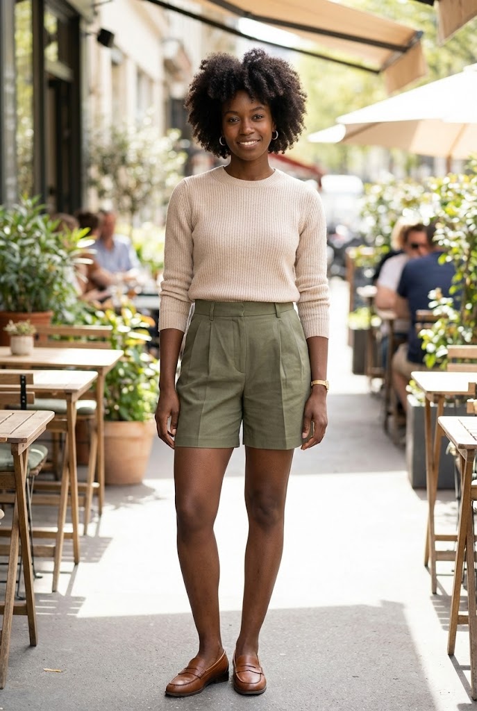 This one surprises people, but it works. A light sweater paired with tailored shorts feels relaxed yet clean.