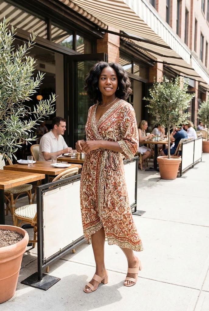 A wrap dress adjusts as you move, which matters during long brunches. Low heels give height without regret.