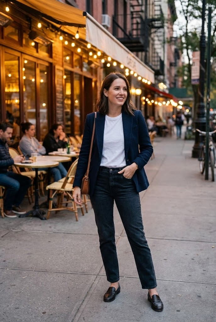 The blazer sharpens the look, while the tee and jeans keep it casual. I love this balance.