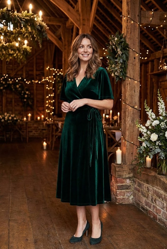 Wrap dresses always feel like a win. They adjust easily and flatter without effort. For winter weddings, the fabric choice matters more than the cut.