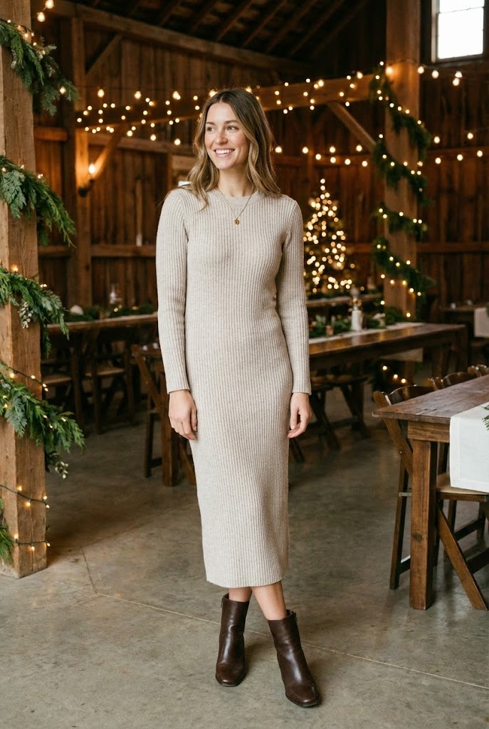 Midi-length sweater dresses work best for winter events. Neutral colors feel timeless and easy to style. Pair it with ankle boots or low heels, and you’re set. Doesn’t it feel nice when comfort doesn’t sacrifice style?