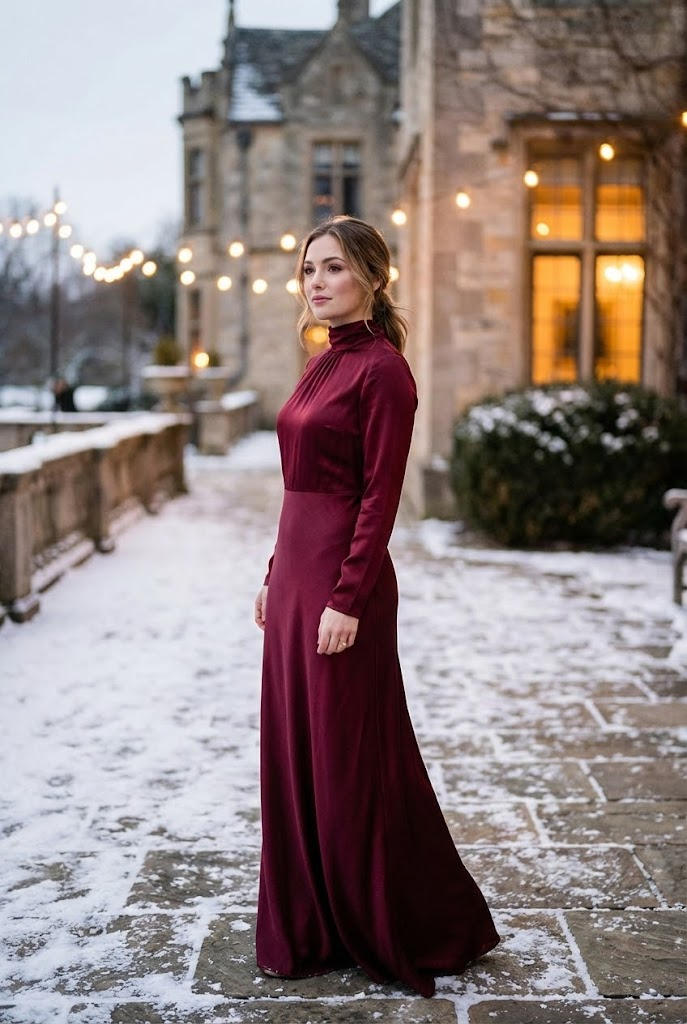 Satin doesn’t scream winter, but hear me out. A satin maxi with long sleeves or a high neckline fits right in at a winter wedding. The key sits in the cut, not just the fabric.