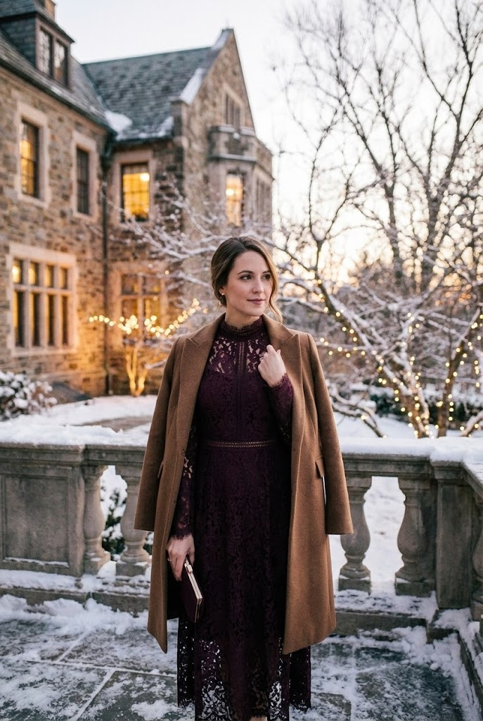 Lace doesn’t belong only to summer weddings. A high-neck lace dress with sleeves feels timeless and refined, especially in winter. The texture adds interest without relying on bold cuts.