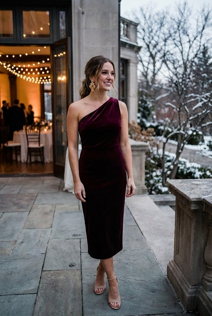 A one-shoulder dress might sound risky for winter, but it works when done right. Use heavier fabrics like velvet or structured satin. Add a wrap or tailored coat for warmth when needed.