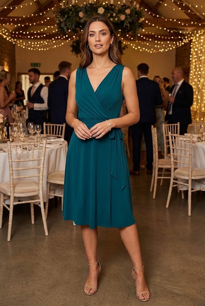 The wrap cocktail dress understands real life. It adjusts easily and flatters the waist without effort. The V-neckline also draws attention upward, which helps create a balanced look.