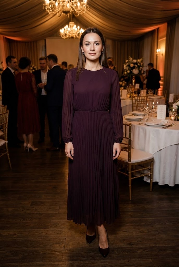 A pleated maxi dress in a dark tone feels graceful and winter-ready. Pleats add movement, which looks stunning when you walk. I wore one to a January wedding and felt comfortable all night.