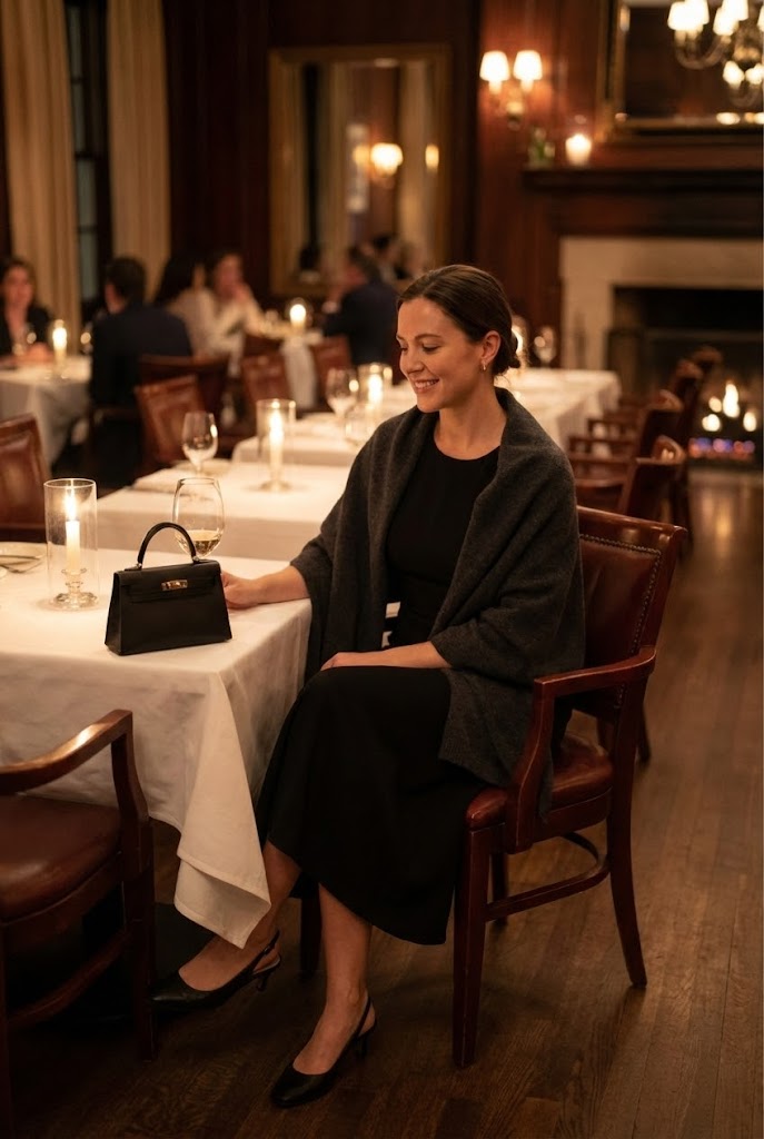 I like a midi-length black dress with clean lines. Nothing bodycon. Nothing flashy. Then I add a soft wool or cashmere wrap.
