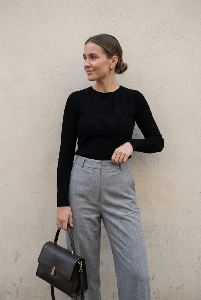 This combo feels modern but rooted in tradition. Gray trousers soften the black top and keep it balanced.