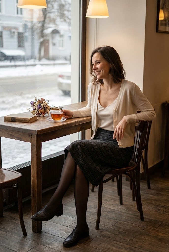 A knee-length wool skirt paired with a fine knit cardigan works beautifully. Button it halfway for shape.