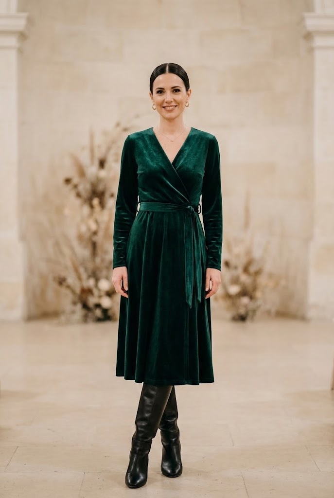 I always reach for a midi wrap dress when I want guaranteed elegance without overthinking it. The wrap shape flatters literally everyone, IMO, and the midi length gives boots space to shine. Pair it with sleek knee-high leather boots, and suddenly you look intentional, not cold.