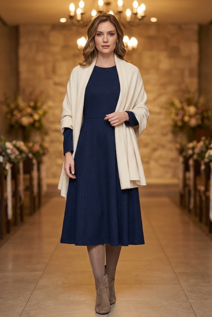 An A-line midi dress gives structure without stiffness, and suede ankle boots soften the look just enough. This pairing works especially well for semi-formal or rustic winter weddings.