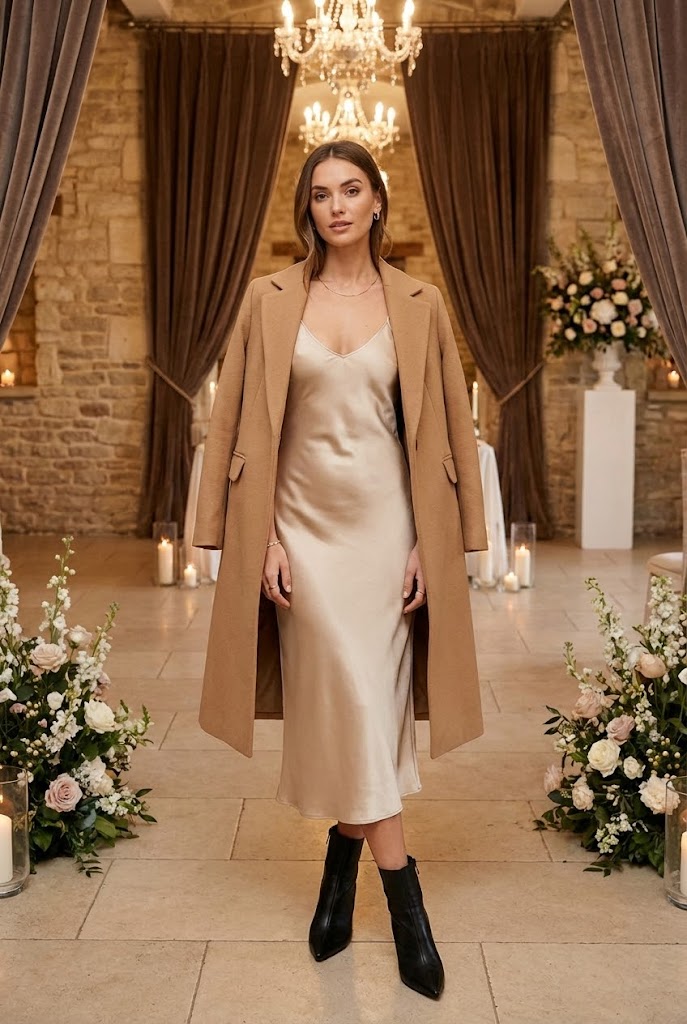 This combo works best indoors or evening weddings. The contrast between soft satin and structured boots looks intentional and modern. Ever noticed how pointed boots instantly make an outfit feel dressier? Exactly.