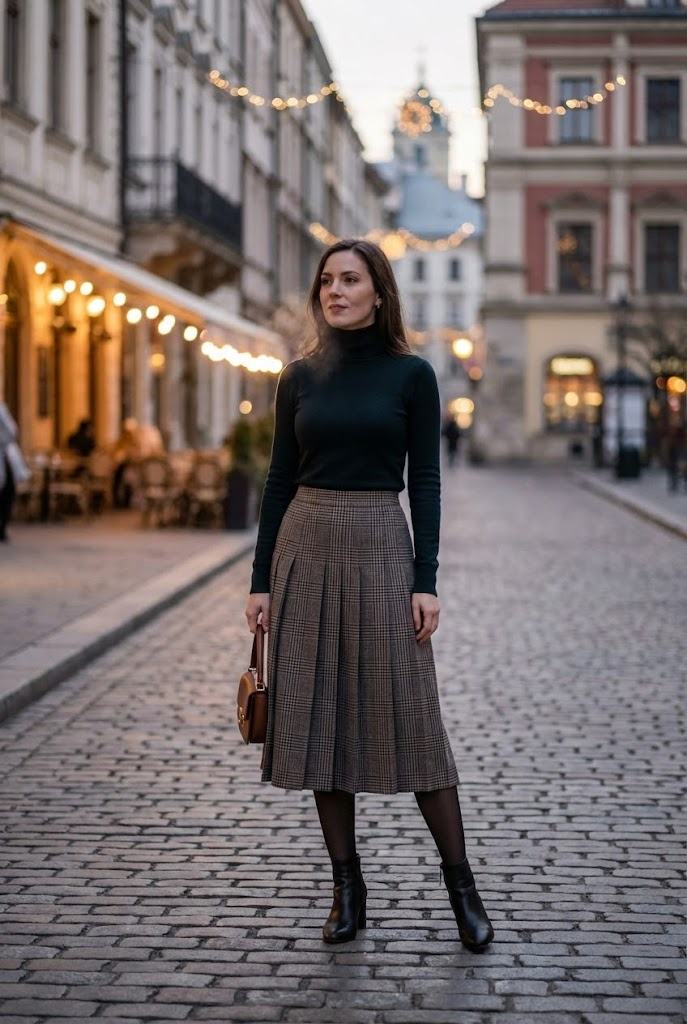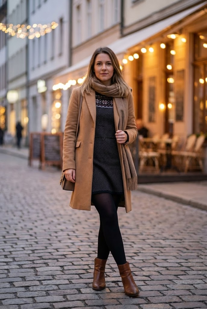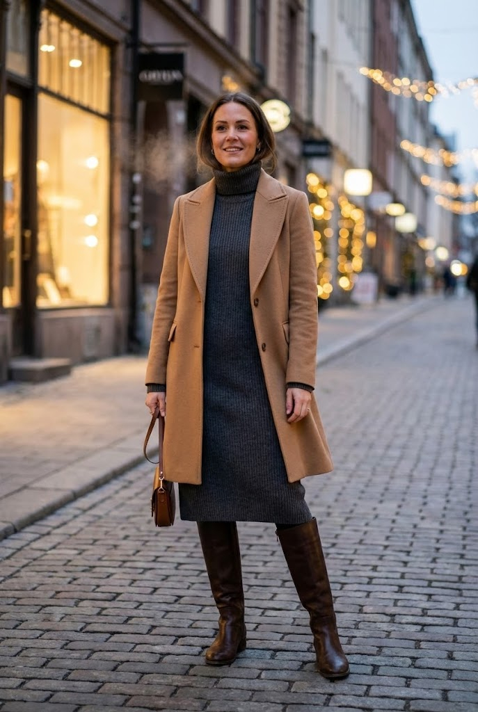 A fitted knit dress traps warmth, while a structured wool coat adds polish. Knee-high boots block cold air better than ankle boots. Ever noticed how much warmer your legs feel this way?
