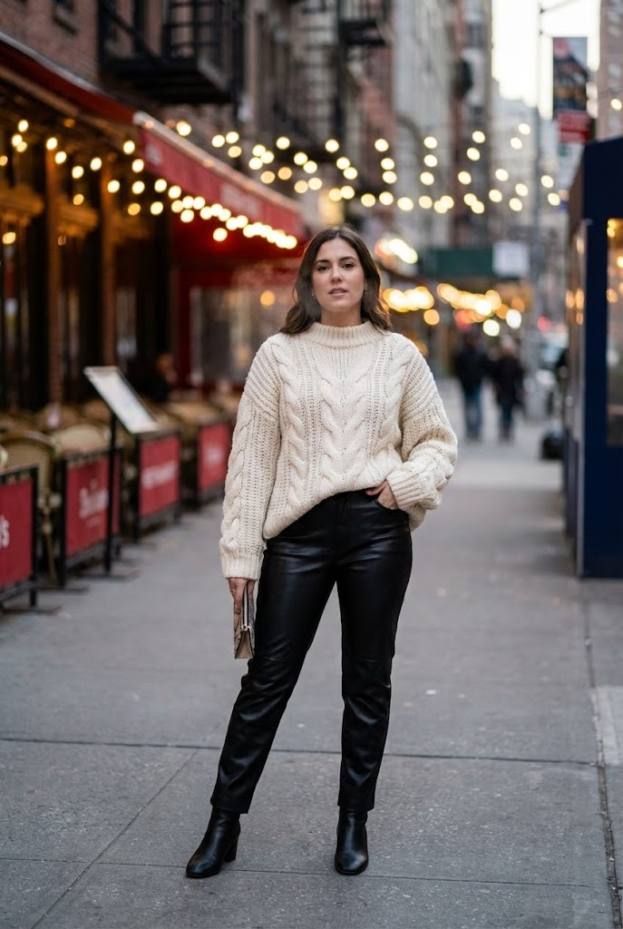 I love a chunky sweater because it feels like wearing a blanket in public. Faux leather pants block wind better than denim, which honestly feels like a winter miracle. Who said warm outfits can’t look bold?