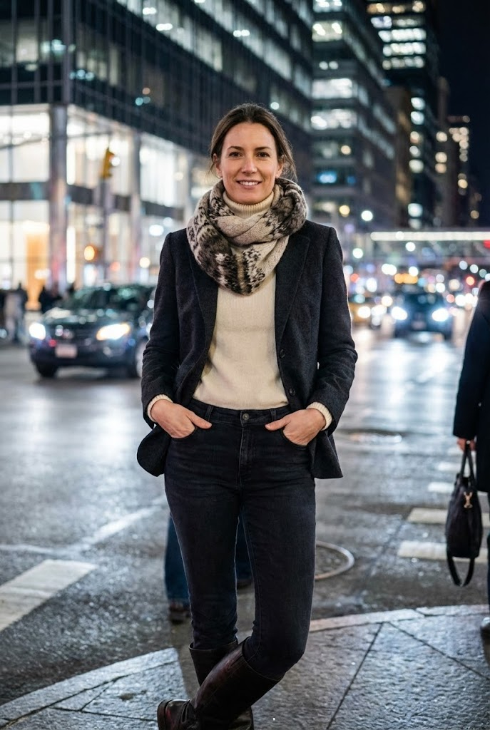 Start with a fitted top, add a blazer, then finish with a wool scarf. You can remove layers indoors without ruining the look. Isn’t flexibility the real luxury?