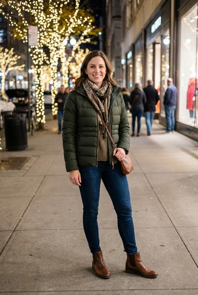 A fitted puffer keeps you warmer than most coats. Slim jeans balance the volume, while Chelsea boots handle cold sidewalks.